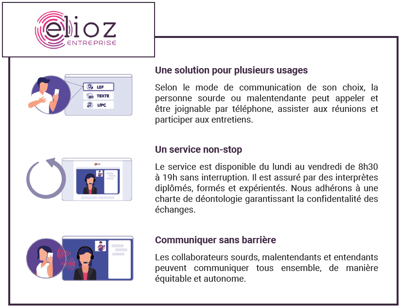 La solution Elioz entreprise permet aux salariés sourds et malentendants de pouvoir téléphoner, assister aux réunions et réaliser des rendez-vous professionnels en face à face. Cette solution d’accessibilité a pour but de favoriser les relations interprofessionnelles entre les collaborateurs entendants, sourds et malentendants, de manière équitable et autonome.